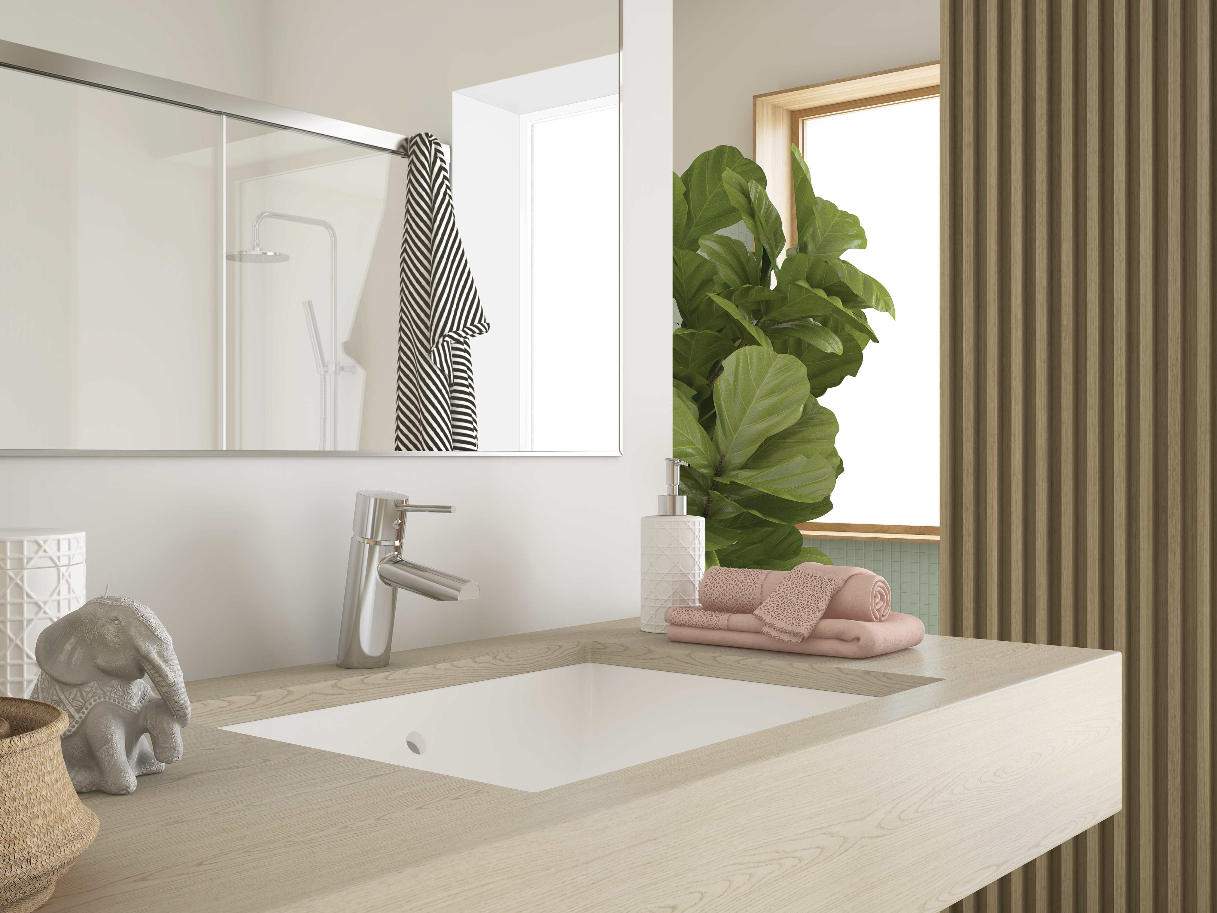Aida é uma referência a um design mais geométrico e cúbico. Um lavatório de encastre por baixo,é uma solução simples e funcional para casas de banho de linhas mais direitas e minimalistas, frequentemente encontradas em espaços públicos.