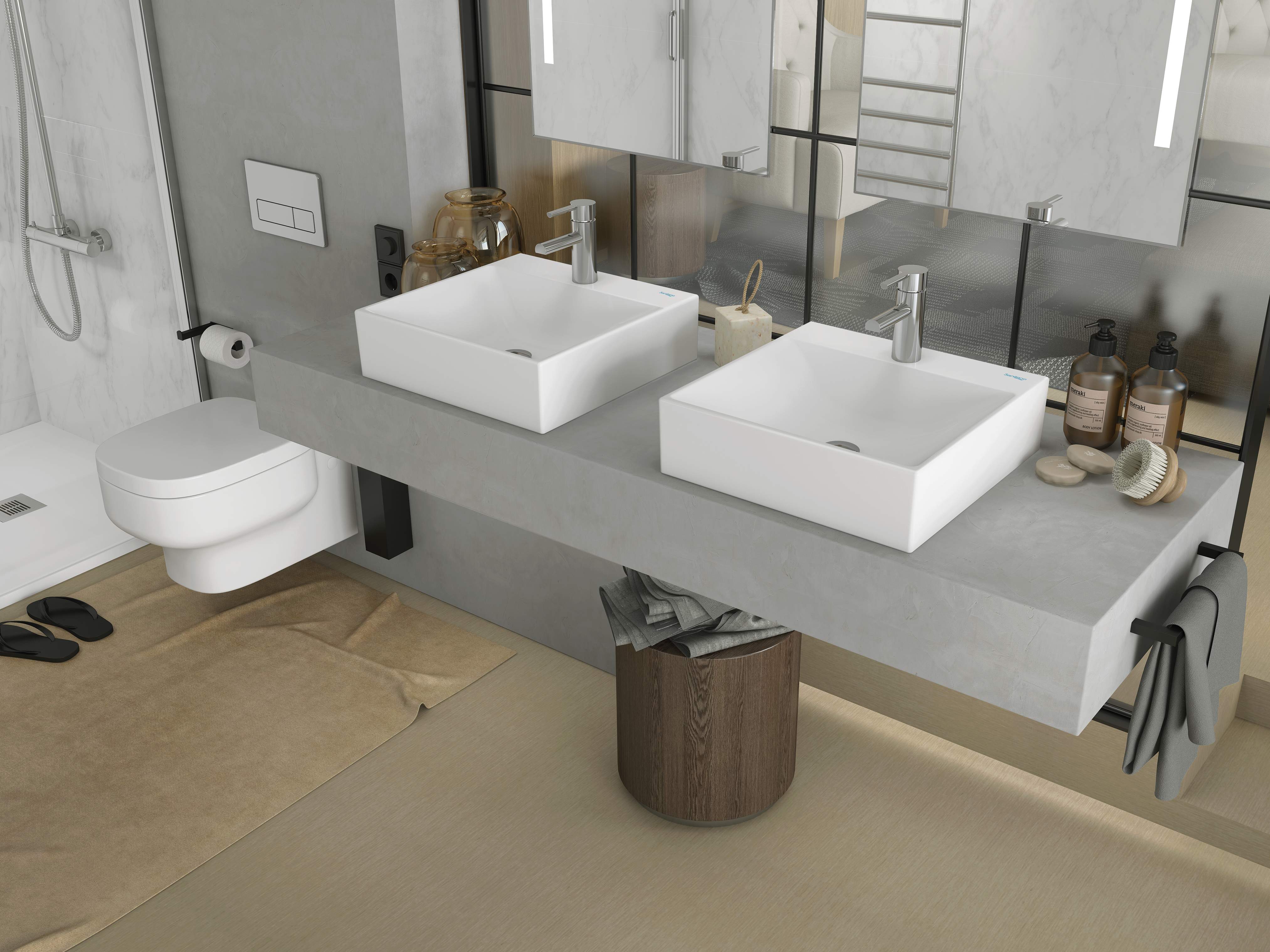 Albus é uma coleção de lavatórios cerâmicos de superfícies fluidas, disponível em versões de fixação à parede, de pousar e semi-encastrar, com tamanhos entre 40 e 100 cm. Disponível com ou sem furação para torneiras, furo de nível e prateleiras para sabonete. As versões de pousar são totalmente vidradas em todas as faces para um acabamento perfeito.