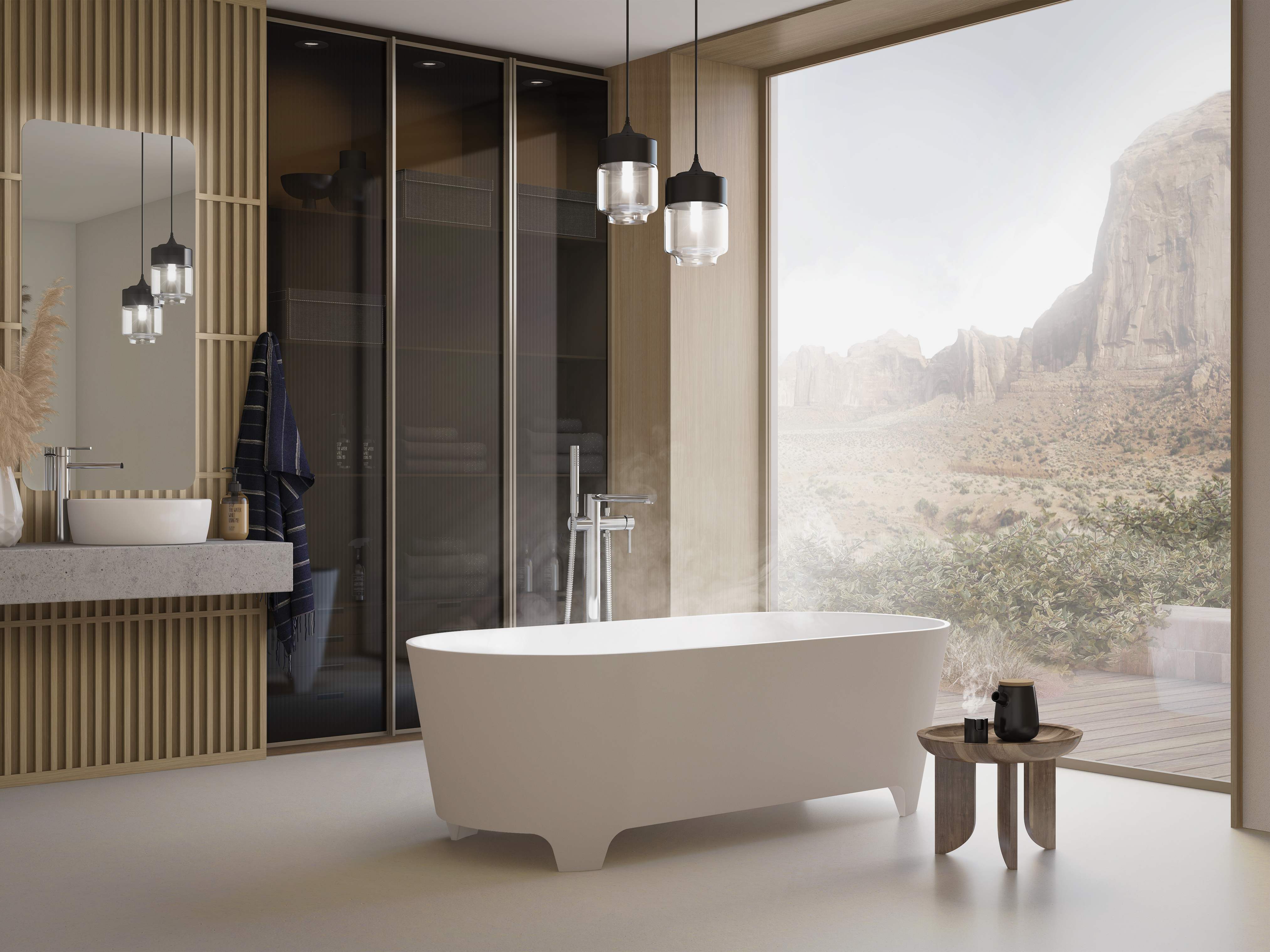 Merece o melhor e é exatamente isso que Aman oferece. Uma banheira freestanding de imersão em Surfex®, disponível num único tamanho (180 x 80 cm), em 3 acabamentos elegantes: branco, cinzento claro e cinzento escuro no exterior.