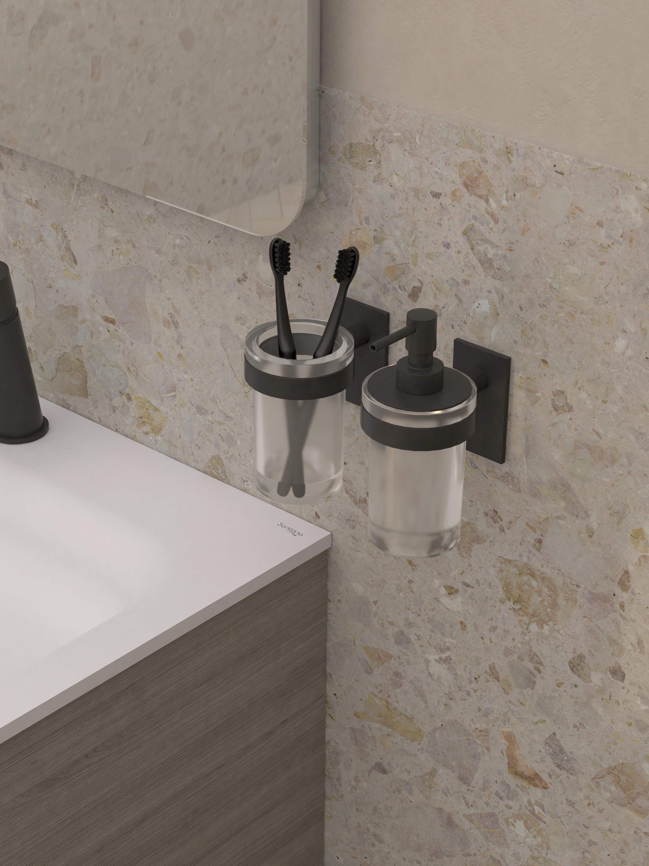 Em vidro fosco e aço inoxidável. Instalação na parede, com adesivos. Na embalagem: copo porta-escovas e kit de fixação.