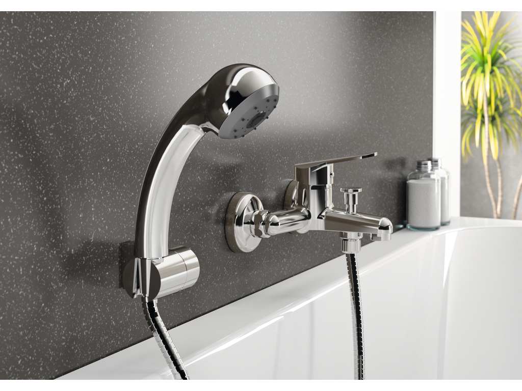 Para instalar na parede (banheiras). Cartucho de discos cerâmicos e perlator. Monocomando. Na embalagem: torneira, chuveiro de mão, suporte, flexível de 150cm e kit de fixação.